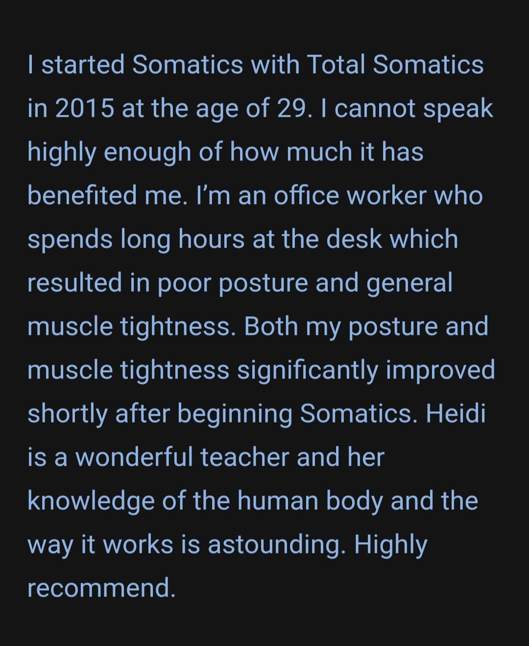 Below are examples of clients who have benefited from Total Somatics and how it has improved various aspects of their health and wellbeing.