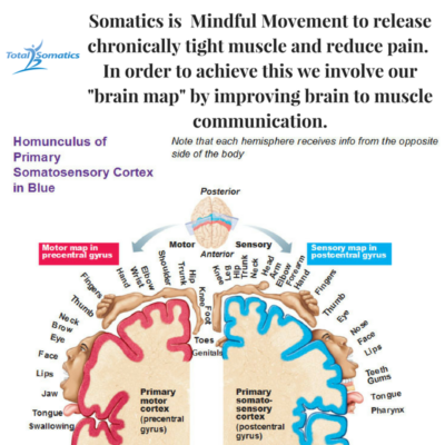Somatic movement ‘wakes up’ all areas of your brain map and re-educates the body in the area of movement. When a person is anxious and in pain, their entire body will freeze with fear. We access and re-train the brain map to work more efficiently and with less hyper sensitivity. When we learn to move our body gently, slowly and mindfully we help the brain notice it is safe to do so. Thereby reducing the actions of the Limbic system (stress response) and accessing higher learning or executive functioning, which is part of the Prefrontal Cortex. When we focus on using the prefrontal cortex, it automatically suppresses the actions of the Limbic system.